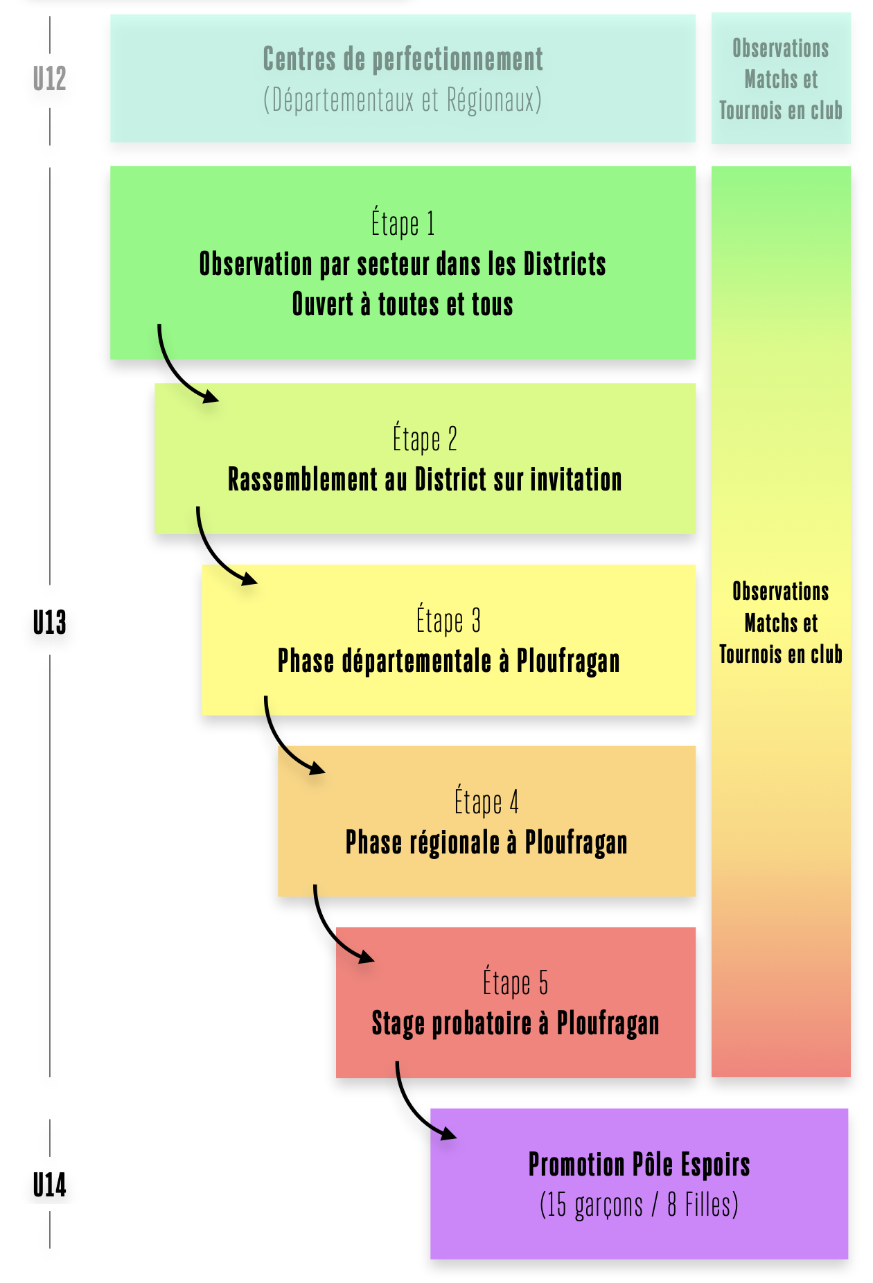 La sélection est effectuée lors de l’année U13 à travers plusieurs phases de détection au sein de chaque district breton et à Ploufragan (22). Les jeunes sont également suivis par l’Équipe Technique Régionale lors des matchs et tournois officiels avec leur équipe et dès les U12 à travers les Centres de Perfectionnement départementaux et régionaux. La sélection repose ainsi sur un suivi long, précis et régulier des jeunes tout au long de leurs années U12 et U13, aussi bien en club que lors des différents rassemblements organisés par la Ligue de Bretagne de Football.